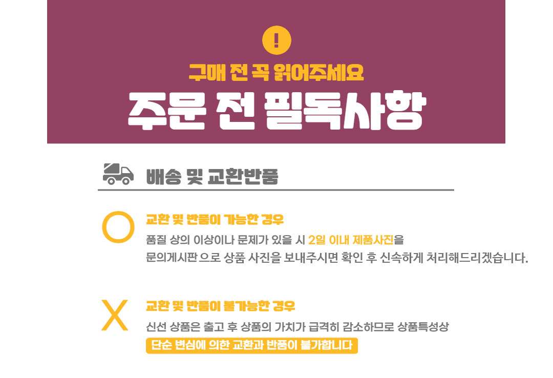 ÀçÆÇ¸Å°¡ ºÒ°¡ÇÑ ½Å¼±/³ÃÀå/½Ò/³Ãµ¿ ½ÄǰÀÇ °æ¿ì, ÁÖ¹®ÀÚÀÇ ´Ü¼ø º¯½ÉÀ¸·Î ÀÎÇÑ ±³È¯ ¹× ¹ÝǰÀº ¾î·Æ½À´Ï´Ù.